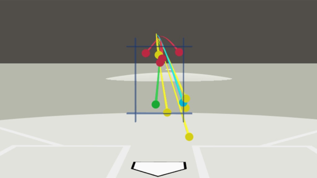 Verlander recorded four strikeouts with his four-seam fastball (red), five with his slider (yellow), one with his curveball (blue) and one with his changeup (green).