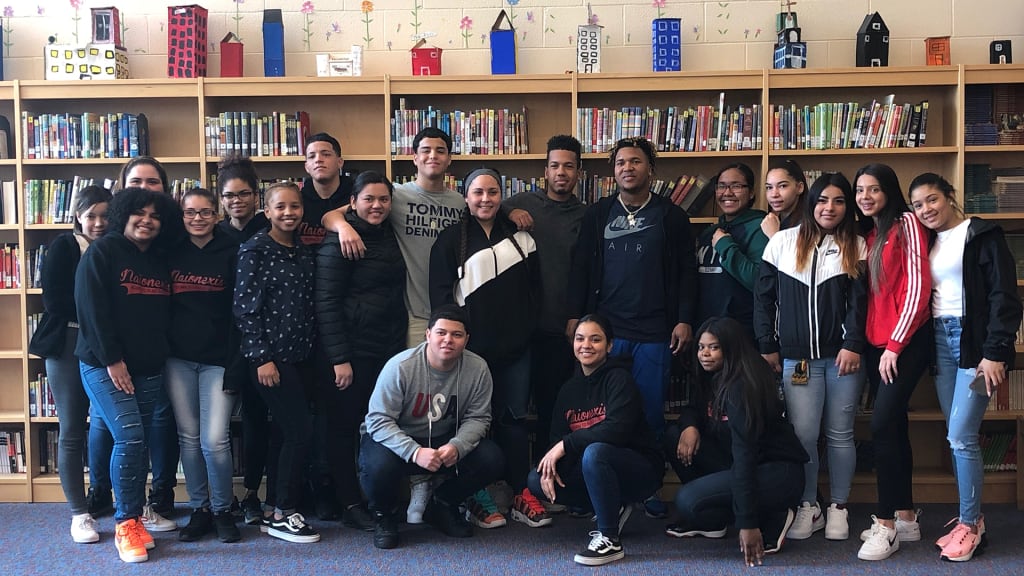 Twenty kids from the academy’s Spanish-speaking senior class gathered in the school’s second-floor library, placing all the chairs in the room in a circle and leaving one open spot for their special guest. After about six or seven minutes, the door to the library creaked open as each of the student’s heads peaked over the bookshelf to get their first glimpse of the All-Star baseball player.