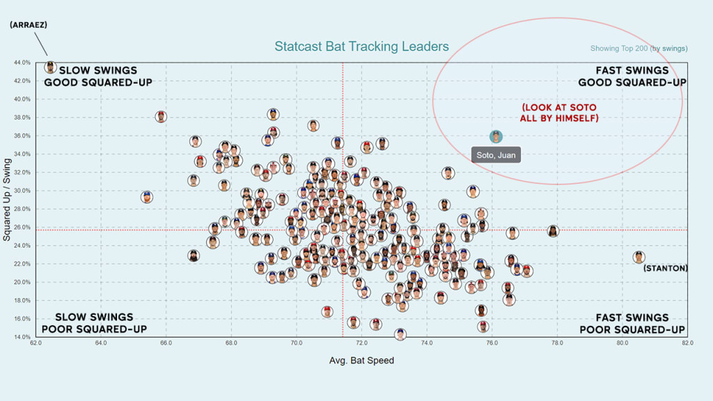 We're now seeing it essentially on a daily basis. On Wednesday, when Soto hit two homers against Seattle, they were both squared-up baseballs (94% and 91%, in order, each above the 80% threshold for 'being squared up'), and they both had fast swings (76.5 mph and 78.8 mph, respectively, each above the 75 mph 'fast swing' threshold.) This makes it all sound so easy. It is extremely not easy.