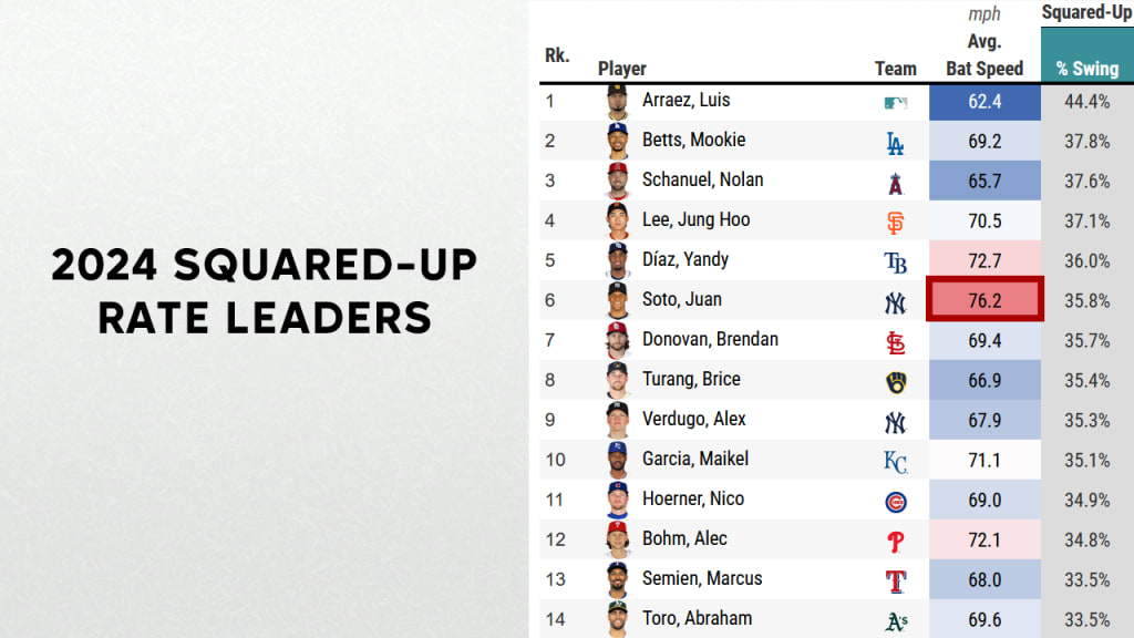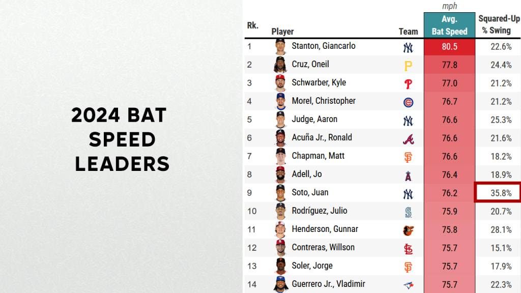 Now, flip it and just look at the bat speed leaders. Aside from Soto, only Henderson (among this group) is above the 26% Major League average for squared-up rate, and even he's well behind the 36% that Soto is at.