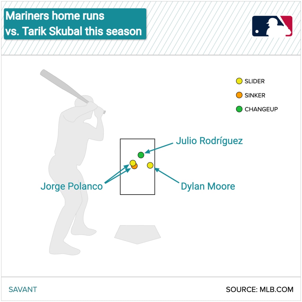The counterpoint is that Skubal, even in the heart of the zone, is extremely hard to hit. He dominates the zone. He's generated 144 whiffs on pitches in the heart of the zone this season, more than any other pitcher, and induced a swing-and-miss rate of nearly 20% on heart-of-zone pitches, one of the highest in the league. So the Mariners will have their work cut out for them to even hit those pitches, let alone hit them out of the ballpark.