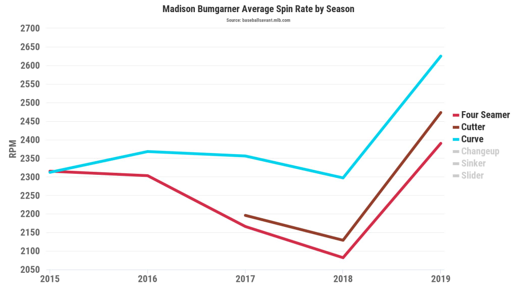 A lot of spin, actually. Bumgarner's spin rate has jumped by more than 300 rpm on each of those three chief pitches in his arsenal: the four-seamer, cutter and curve. He's gone from below-average to above-average spin on each pitch type, and their spin rates are all at their highest of any season under Statcast tracking.