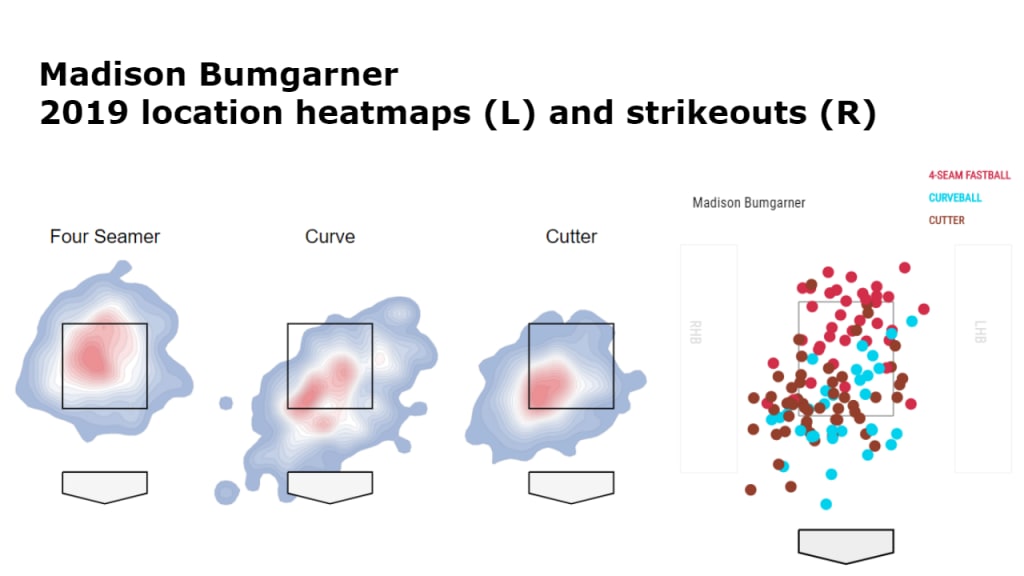 In kind, Bumgarner's swing-and-miss rate has jumped on all three pitch types: 12.8% to 21.4% on his four-seamer, 24.9% to 27.4% on his cutter and 27.4% to 33.9% on his curve.