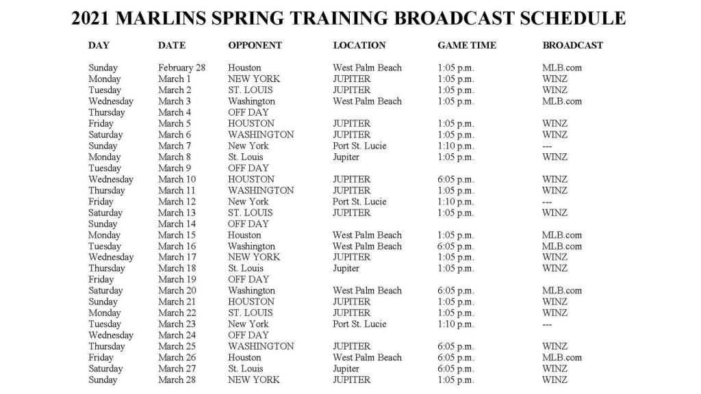 JUPITER, Fla. -- The Marlins on Saturday released their 2021 Spring Training radio broadcast schedule. A source told MLB.com that the club intends to have a video element accompany the radio broadcasts to start the spring.
