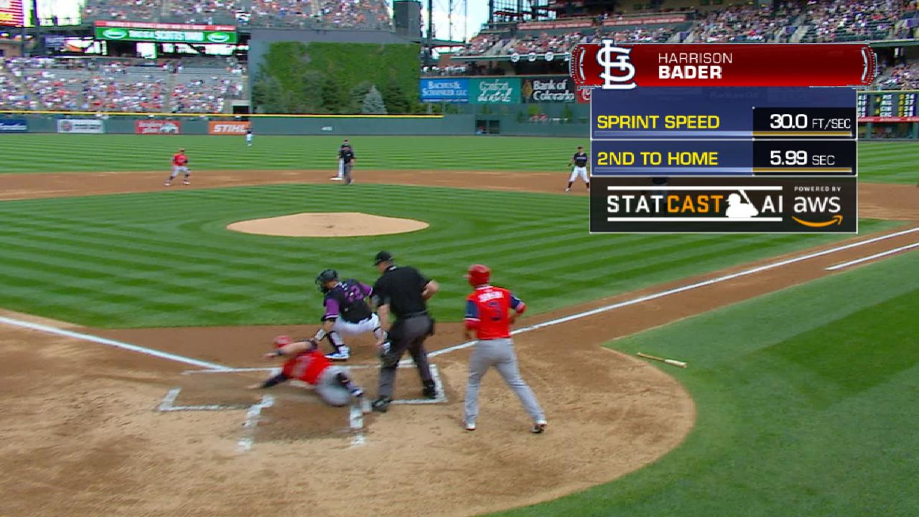 Never stopping as he rounded third, Bader motored home from second while Gomber's ball hung in the sky above the infield. By the time Rockies second baseman LeMahieu realized he had no play at first, Bader was nearly home. It took the center fielder just 5.99 seconds, per Statcast™, the second-fastest second-to-home time by a St. Louis player since tracking began.