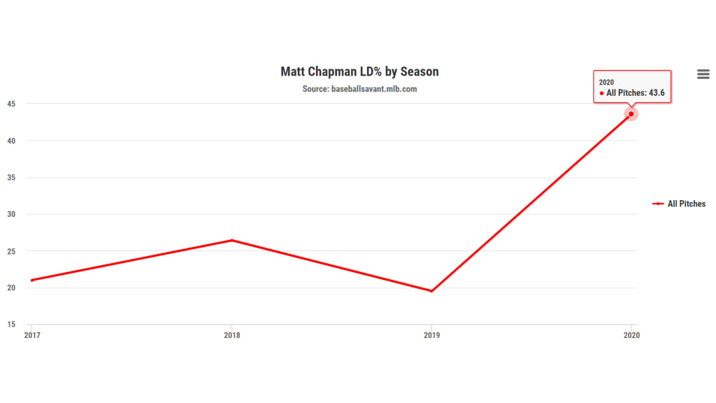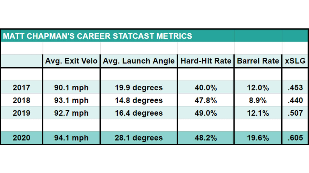 \n","providerName":"Twitter","providerUrl":"https://twitter.com","thumbnail_url":null,"type":"oembed","width":550,"contentType":"rich"},{"__typename":"Markdown","content":"Chapman is second in the American League with 48 total bases, thanks to a Major League-high 13 extra-base hits -- six homers, five doubles and two triples. That slug doesn't come on the ground.\n\nLet's break down what Chapman is doing right.","type":"text"},{"__typename":"Markdown","content":"#### **He's cut his ground-ball rate more than any hitter**","type":"text"},{"__typename":"Image","caption":null,"contextualCaption":null,"contextualAspectRatio":null,"credit":null,"contentType":"Photography","format":"png","templateUrl":"https://img.mlbstatic.com/mlb-images/image/private/{formatInstructions}/mlb/uskwdcoc2buwcyqvmrvh","type":"image"},{"__typename":"Markdown","content":"Chapman's 41.7% ground-ball rate last season wasn't high by any means; you don't hit 36 home runs in a season by going ground-ball heavy. But he's still cut it nearly in half this season. No regular hitter has slashed his ground-ball rate more than Chapman.\n\n**Largest GB rate decreasers, 2019 to 2020** \n_Min. 100 batted balls in '19 and 40 batted balls in '20_ \n**Matt Chapman (OAK): -20.3 points (41.7% to 21.4%)** \nJosé Iglesias (BAL): -13.8 points (53.3% to 39.5%) \nAnthony Santander (BAL): -11.9 points (40.3% to 28.4%) \nStarlin Castro (WSH): -11.9 points (48.1% to 36.2%) \nCharlie Blackmon (COL): -10.4 points (40.3% to 29.9%) \nNolan Arenado (COL): -10.3 points (36.8% to 26.5%) \nJesús Aguilar (MIA): -10.3 points (42.9% to 32.6%)\n\nThe air contact leaders and largest ground-ball decreasers are a mix of stars and strong starters in 2020 -- Blackmon hitting close to .500, Santander ranking an out-of-nowhere second in the AL in RBIs to Aaron Judge, Trout is Trout, and so on. But Chapman tops the lists, and he plays Platinum Glove defense, too.\n\n_Just_ getting the ball off the ground isn't all there is to it, of course. Hitting the ball in the air is Step 2. We have to rewind to Step 1.","type":"text"},{"__typename":"Video","contentDate":"2020-08-14T14:00:00Z","preferredPlaybackScenarioURL({\"preferredPlaybacks\":\"mp4AvcPlayback\"})":"https://bdata-producedclips.mlb.com/bf7fb878-9ac9-4c75-9a5b-72c5ba3a4193.mp4","type":"video","description":"Matt Chapman has the most hard-hit air contact in the Majors this season","displayAsVideoGif":false,"duration":"00:01:27","slug":"matt-chapman-s-hard-hit-air-contact","tags":[{"__typename":"InternalTag","slug":"season-2020","title":"Season 2020","type":"season"},{"__typename":"PersonTag","slug":"playerid-656305","title":"Matt Chapman","person":{"__ref":"Person:656305"},"type":"player"}],"thumbnail":{"__typename":"Thumbnail","templateUrl":"https://img.mlbstatic.com/mlb-images/image/private/{formatInstructions}/mlb/lidlokota84rbii2pkfr"},"title":"Matt Chapman's hard-hit air contact","relativeSiteUrl":"/video/matt-chapman-s-hard-hit-air-contact"},{"__typename":"Markdown","content":"**He's lifting his best contact** \nStep 1 is hit the ball hard. Chapman has always hit the ball really hard, a lot, and he's still hitting the ball really hard, a lot. And he's taking all that hard contact into the air.\n\nHere's a look at Chapman's Statcast data.","type":"text"},{"__typename":"Image","caption":null,"contextualCaption":null,"contextualAspectRatio":null,"credit":null,"contentType":"Photography","format":"png","templateUrl":"https://img.mlbstatic.com/mlb-images/image/private/{formatInstructions}/mlb/yzpobjsjorywven00tb4","type":"image"},{"__typename":"Markdown","content":"Chapman has always had the elite exit velocity -- he's been in the top 10 in MLB each of the past three seasons -- and he's at a career best. A hard-hit ball is 95-plus mph; Chapman is averaging close to that. Almost half his batted balls are hard-hit. That's great.\n\nBut what you really want to pay attention to is the launch. About one in every five balls Chapman has hit this season is a \"barrel\" \\-\\- the best level of contact, requiring ideal exit velocity _and_ ideal launch angle. Barrels are the kind of contact that turns into home runs and extra-base hits. Chapman is tied for the Major League lead with 11.\n\n**Most barrels, 2020** \n**Matt Chapman (OAK): 11** \nCorey Seager (LAD): 11 \nJorge Soler (KC): 11 \nNick Castellanos (CIN): 11 \nFernando Tatis Jr. (SD): 10 \nBrandon Lowe (TB): 10\n\nGoing back to the 151 hitters with 40 or more batted balls this season, Soler, Castellanos and Seager are the only ones barreling the ball at a higher rate than Chapman. One in every eight plate appearances has ended with Chapman barreling the ball, behind only Seager, Soler, Eloy Jiménez, Bo Bichette and Castellanos.\n\nOf Chapman's 27 hard-hit balls in 2020, only four are ground balls. That's just 14.8% of his hard contact. In 2019, 37.6% of Chapman's hard-hit balls went on the ground. That's not a waste, exactly -- hitting the ball hard is always good -- but what he's doing now is better.","type":"text"},{"__typename":"Video","contentDate":"2020-08-08T22:22:17.32Z","preferredPlaybackScenarioURL({\"preferredPlaybacks\":\"mp4AvcPlayback\"})":"https://cuts.diamond.mlb.com/FORGE/2020/2020-08/08/dde8acfd-f43d8d70-1c66f425-csvm-diamondx64-asset_1280x720_59_4000K.mp4","type":"video","description":"Matt Chapman drills a solo home run in the 8th inning to right-center field, giving the A's a 3-0 lead","displayAsVideoGif":false,"duration":"00:00:29","slug":"matt-chapman-homers-3-on-a-line-drive-to-right-center-field","tags":[{"__typename":"InternalTag","slug":"season-2020","title":"Season 2020","type":"season"},{"__typename":"GameTag"},{"__typename":"PersonTag","slug":"playerid-656305","title":"Matt Chapman","person":{"__ref":"Person:656305"},"type":"player"},{"__typename":"TeamTag","slug":"teamid-133","title":"Oakland Athletics","team":{"__ref":"Team:133"},"type":"team"},{"__typename":"TaxonomyTag","slug":"hitting","title":"hitting","type":"taxonomy"},