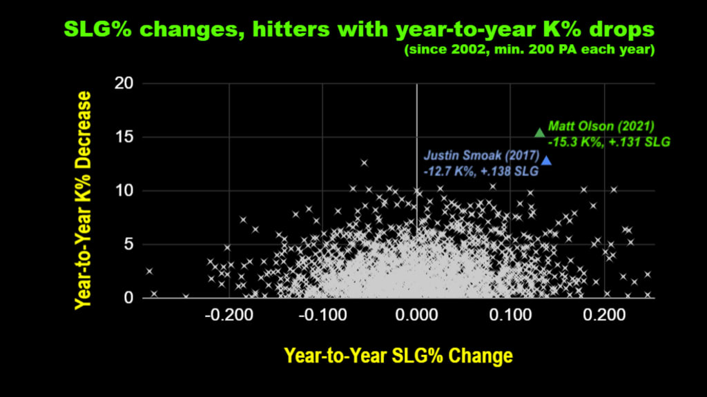 That’s a sample of more than 2,200 hitters that decreased their strikeout rate by at least one decimal point from one year to the next. Olson, by virtue of a double-digit K% dip and 100-plus point slugging increase, is in a club of two.