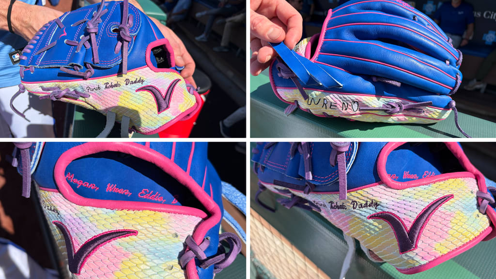 Featuring pink, purple and a rainbow pattern, Strahm’s glove was designed with a whole lot of love from his 5-year-old daughter, Wren, and he’s itching to bring it into a game at some point. Victus -- the bat company that has dived into glove-making recently, too -- allowed Wren to put all her favorite things on this glove for her dad. The rainbow pattern was key, and they embroidered Wren’s name in her handwriting on the outside part of the glove.