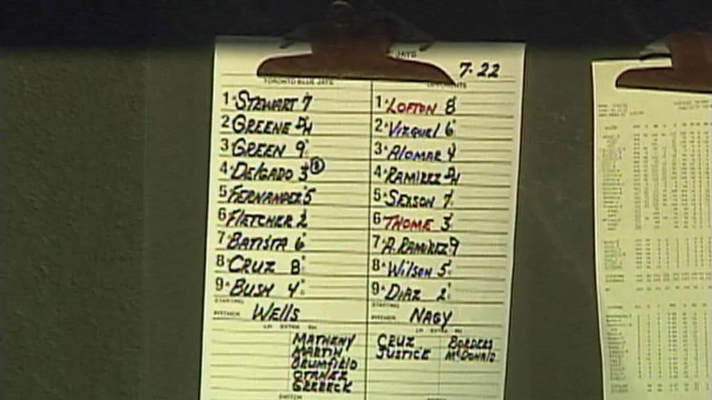 So they unearthed the actual game tape from storage -- Blue Jays at Indians, July 22, 1999 -- complete with the broadcast audio. It didn't take long to find what we were looking for: Because the Baseball Gods are not without a sense of humor, the first batter of the game, Toronto's Shannon Stewart, flew out to right fielder Manny Ramirez ... at which point Blue Jays skipper Jim Fregosi noticed that something was off.
