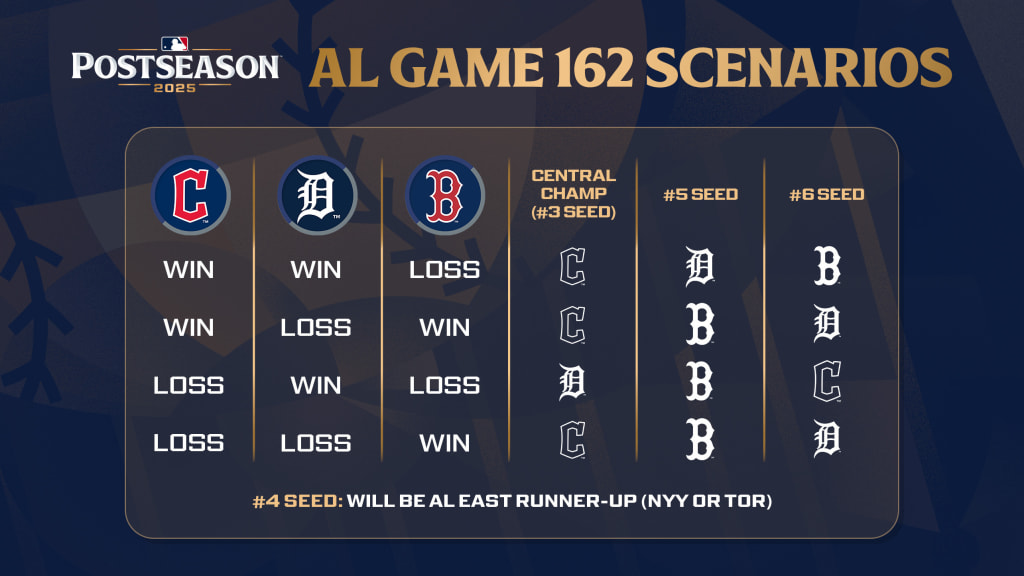 Also of note: There is a scenario where the Tigers end up as the No. 5 seed in the AL. If they win the final game against the Red Sox on Sunday, both teams would have 88 wins (Detroit owns the tiebreaker by virtue of winning the season series). If Cleveland also wins Sunday, the Guardians would take the division and be the No. 3 seed, while the Tigers and Red Sox would slot in as the No. 5 and 6 seeds, respectively.