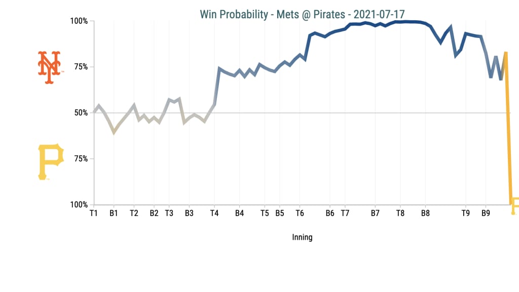 If the weekend's baseball action taught us anything, it's that you should never turn off a Mets game. On Saturday, the Mets held a 6-0 lead against the Pirates going into the bottom of the eighth. It was 7-5 heading into the bottom of the ninth, and it seemed almost impossible for the Mets to lose. At least, that's what the win probability chart said: