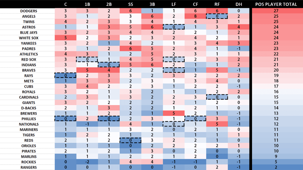 That leaves us with 22 teams. Then, we'll look at the positional breakdowns (as of 8 p.m. ET Monday) and make a color-coded projected WAR chart that shows red as "good" and blue as "weak." In the world of WAR, 2 is roughly average, and anything north of 4 is a star, but it's those handful of 0 WAR areas we're most interested in. If we just look at position players -- every team could use another handful of pitchers -- and ignore DH, due to the uncertain status of it in the NL next year, we'll find that on our 22 contenders, we have 13 problem spots, highlighted in dotted boxes below.