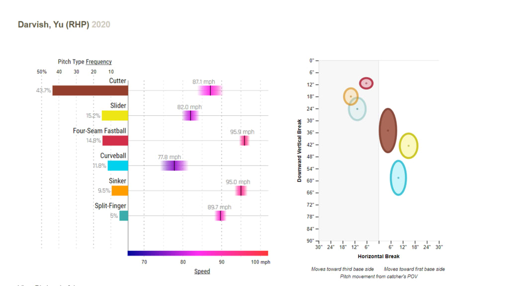 Breakdown: After a rocky Padres debut, Darvish looked more like himself his last time out, holding the Giants to one run off three hits over six innings. He gave up plenty of hard contact in his 2021 debut against the D-backs, but that's likely the exception, not the norm. Darvish had four different pitches account for a whiff rate of at least 30% last season: four-seamer (42.3%), slider (39.7%), curveball (31.2%) and cutter (30.6%). And that’s coming from a guy who has as many as 11 different pitches.
