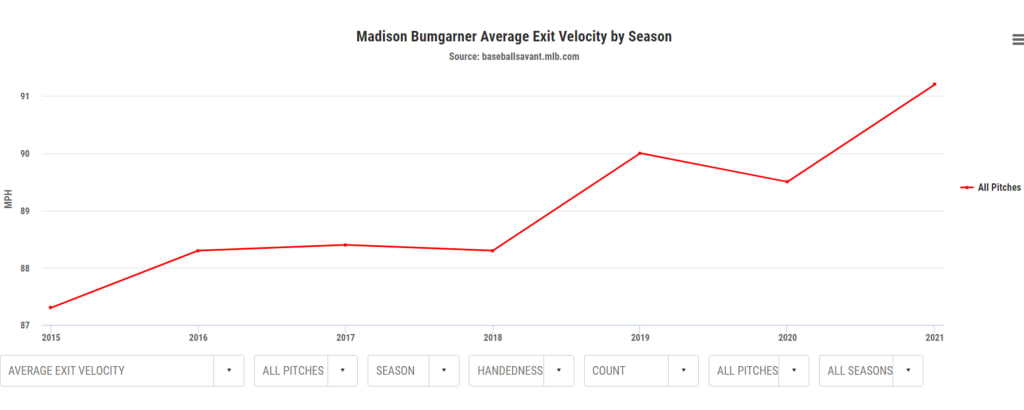 Breakdown: Though Bumgarner's velocity has gone up a tick from last year (90.0 mph average four-seamer this season compared to 88.4 mph in 2020), he's been getting hit -- and hit hard -- this season. He's allowing an average exit velocity of 93.4 mph, with 17 of the 32 batted balls he's allowed coming off the bat with an exit velocity of at least 95 mph. Put it all together and he's allowed 11 runs off 15 hits, five walks and two hit batsmen in just nine innings of work this season.