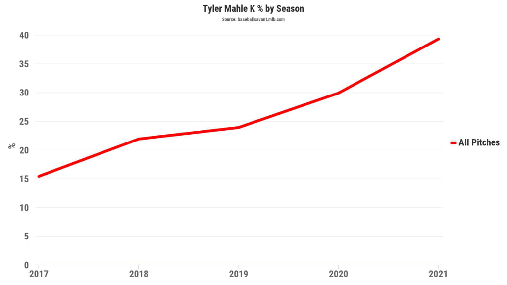 Breakdown: Mahle has raised his strikeout percentage every year of his big league career, going from 15.2% in 2017 to 21.7% in '18 and 23.2% in '19 before setting another career high at 29.9% last season. With his four-seam fastball sitting at 94.9 mph so far this year (up from 93.9 mph last season), he's upped that K% to a whopping 39.3% in the early-going. He'll throw that fastball more than 50% of the time, while also working a slider and splitter into his three-pitch mix.