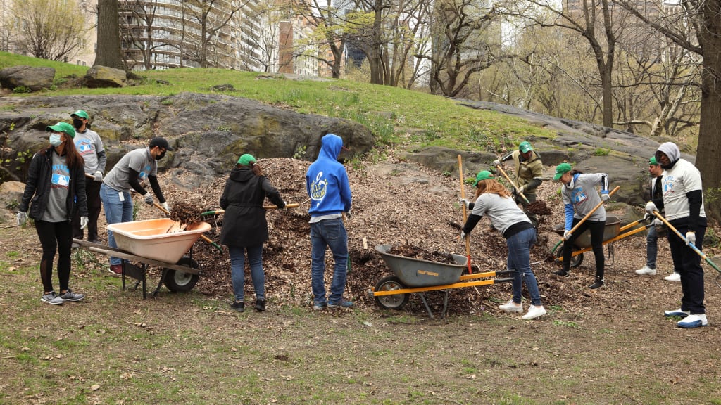 On Monday, about 20 MLB employees gave three hours of their time for an Earth Day volunteer event with the Central Park Conservancy. They worked hard to clean the park's landscape; some raked up leaves, while others put garbage where it rightfully belonged -- in the garbage can.