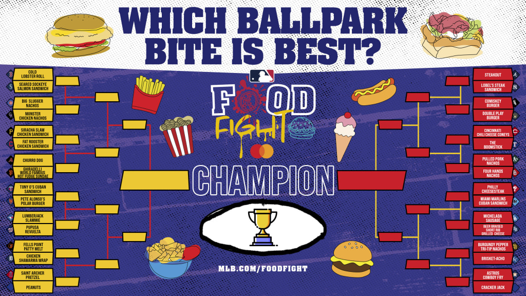 \n","providerName":"Twitter","providerUrl":"https://twitter.com","thumbnail_url":null,"type":"oembed","width":550,"contentType":"rich"},{"__typename":"Markdown","content":"Here are the top 10 so far, with Philadelphia pulling ahead with the deliciously cheesy Philly cheesesteak in the early lead.\n\n1\\. Philly Cheesesteak (PHI)\n\n2\\. Cold Lobster Roll (BOS)\n\n3\\. The Boomstick (TEX)\n\n4\\. Ghirardelli World Famous Hot Fudge Sundae (SF)\n\n5\\. Cincinnati Chili Cheese Coneys (CIN)\n\n6\\. Lobel's Steak Sandwich (NYY)\n\n7\\. Burgundy Pepper Tri-Tip Nachos (SD)\n\n8\\. Churro Dog (ARI)\n\n9\\. Pete Alonso's Polar Burger (NYM)\n\n10\\. Peanuts\n\nPerhaps most surprising of all is how most of these are the ballpark classics. The crazy overloaded burgers and giant sandwiches may get the press, but when push comes to shove, people mostly want the classics. Pete Alonso's burger, which debuted this season, is the only new food option to crack the top 10 and it comes in _just_ ahead of plain old peanuts.\n\nWe've got a few notable first-round matchups, too.\n\n\\- The Rangers' Boomstick is taking on the Reds' Cincinnati Chili Cheese Coneys and both are proving to be popular, with each among the Top 5 choices to win. The problem? Only one can advance. The other will be a hard-luck first-round loser.\n\n\\- Nachos can't beat nachos! Both nacho matchups (A's pulled pork nachos vs. Cardinals Four Hands nachos and Padres' Burgundy pepper tri-tip nachos vs. the Royals' Brisket-achos) are in a 51-49 battle.\n\n\\- Pete Alonso's sandwich is winning the player battle over Tony Olivia's Cuban sandwich, 52-48.\n\n\\- The churro dog may be a top 10 pick, but it's not likely to beat the Giants' ice cream sundae. The ice cream is winning, 58-42.\n\n\\- Seattle's salmon sandy is no match for Boston's cold lobster roll. Boston is, excuse me, _rolling_ in that matchup, 68-32.\n\nRight now the most likely Final Four matchups are both World Series rematches, too. The most likely final at the moment is either a replay of the 1986 World Series with the Red Sox and Mets squaring off (Cold Lobster Roll vs. Pete Alonso's Polar Burger), or a repeat of the 2009 Fall Classic with the Yankees' Lobel's Steak Sandwich taking on the Philly Cheesesteak.\n\nBut with one more week of voting, anything can happen. So, make your voice heard and help put your favorite food over the top. Head over to MLB.com/FoodFight to vote.","type":"text"}],"relativeSiteUrl":"/news/mlb-food-fight-top-ten-results","contentType":"news","subHeadline":"32 foods enter. Only one can win","summary":"There's still a long way to go in the baseball season and every team -- no matter how quickly they got out of the gate or how poorly they started the year -- has at least the mathematic possibility of winning the World Series. But when it comes to which","tagline({\"formatString\":\"none\"})":null,"tags":[{"__typename":"InternalTag","slug":"storytype-article","title":"Article","type":"article"},{"__typename":"ContributorTag","slug":"michael-clair","title":"Michael Clair","type":"contributor"},{"__typename":"TaxonomyTag","slug":"offbeat","title":"offbeat","type":"taxonomy"},{"__typename":"TaxonomyTag","slug":"food","title":"food","type":"taxonomy"}],"type":"story","thumbnail":"https://img.mlbstatic.com/mlb-images/image/private/{formatInstructions}/mlb/gqa2e3lbsln5bw7wvqs4","title":"MLB Food Fight top ten results"},"getTeamsBySportId({\"ids\":[1]})":[{"__ref":"Team:133"},{"__ref":"Team:134"},{"__ref":"Team:135"},{"__ref":"Team:136"},{"__ref":"Team:137"},{"__ref":"Team:138"},{"__ref":"Team:139"},{"__ref":"Team:140"},{"__ref":"Team:141"},{"__ref":"Team:142"},{"__ref":"Team:143"},{"__ref":"Team:144"},{"__ref":"Team:145"},{"__ref":"Team:146"},{"__ref":"Team:147"},{"__ref":"Team:158"},{"__ref":"Team:108"},{"__ref":"Team:109"},{"__ref":"Team:110"},{"__ref":"Team:111"},{"__ref":"Team:112"},{"__ref":"Team:113"},{"__ref":"Team:114"},{"__ref":"Team:115"},{"__ref":"Team:116"},{"__ref":"Team:117"},{"__ref":"Team:118"},{"__ref":"Team:119"},{"__ref":"Team:120"},{"__ref":"Team:121"}],"getHeaderFromForgePath({\"contentSource\":\"MLB\",\"headerPath\":\"/_navs/header/mlb/global-nav\",\"locale\":\"en-US\",\"paletteKey\":\"mlb-base-palette\",\"propertiesKey\":\"mlb-global-properties\"})":{"__typename":"Header","navigation":[{"__typename":"NavItem","customPropertiesString":"align:right;","icon":null,"linkTarget":null,"linkText":"MLB.TV","linkUrl":"https://www.mlb.com/tv?&affiliateId=mlbMENUtv","placement":"right","visible":"true","subNav":[{"__typename":"SubnavColumn","title":null,"navigation":[{"__typename":"NavItem","placement":null,"linkText":"Buy MLB.TV","linkUrl":"/live-stream-games/subscribe?&affiliateId=mlbMENUtv","linkTarget":null,"visible":"true","icon":null,"tooltip":null,"customPropertiesString":null},{"__typename":"NavItem","placement":null,"linkText":"Learn More","linkUrl":"https://www.mlb.com/live-stream-games/partners/espn?&affiliateId=mlbMENUtv","linkTarget":null,"visible":null,"icon":null,"tooltip":null,"customPropertiesString":null},{"__typename":"NavItem","placement":null,"linkText":"MLB.TV ST Schedule","linkUrl":"https://www.mlb.com/live-stream-games/spring-training","linkTarget":null,"visible":null,"icon":null,"tooltip":null,"customPropertiesString":null},{"__typename":"NavItem","placement":null,"linkText":"All Packages","linkUrl":"/live-stream-games/subscribe/allpackages?&affiliateId=mlbMENUtv","linkTarget":null,"visible":"","icon":null,"tooltip":null,"customPropertiesString":null},{"__typename":"NavItem","placement":null,"linkText":"Buy MLB+","linkUrl":"/live-stream-games/subscribe/mlbplus?&affiliateId=mlbMENUtv","linkTarget":null,"visible":"false","icon":null,"tooltip":null,"customPropertiesString":null},{"__typename":"NavItem","placement":null,"linkText":"Watch & Listen","linkUrl":"/live-stream-games?&affiliateID=mlbMENUtv","linkTarget":null,"visible":"true","icon":null,"tooltip":null,"customPropertiesString":null},{"__typename":"NavItem","placement":n