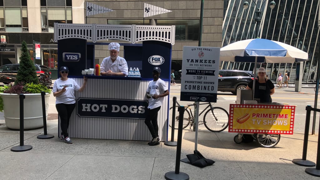 On Wednesday, FOX Sports strategically placed hot dog stands directly outside several agencies in New York City. They distributed free hot dogs from two stands positioned at each area. One stand was providing jumbo foot-long hot dogs. This stand represented YES Network and FOX Sports signage. The adjacent stand -- merely two feet away -- offered cocktail franks wrapped in buns no larger than a pinky finger. This stand represented primetime programming.