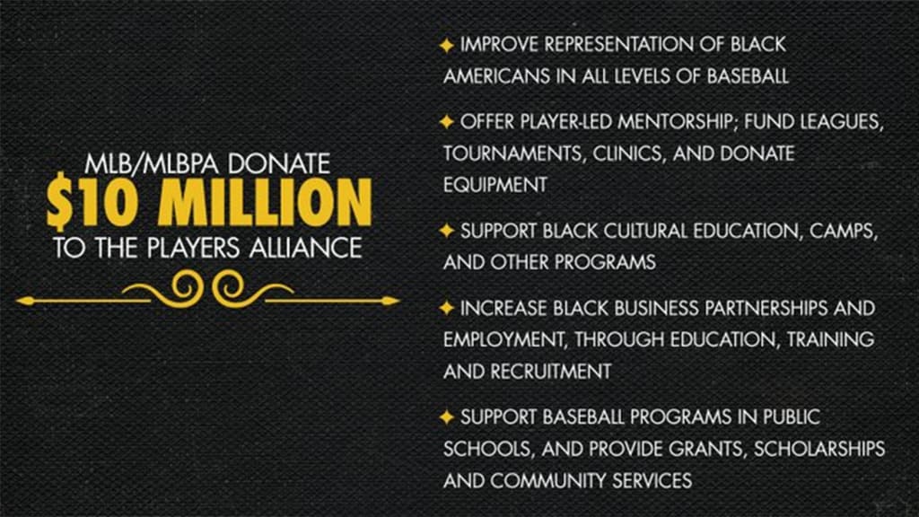 NEW YORK -- In a partnership with The Players Alliance, a nonprofit organization comprised of active and former Major League Players, Major League Baseball and the Major League Baseball Players Association have committed $10 million to help fund innovative programs designed by The Players Alliance to improve representation of Black Americans in all levels of baseball. These efforts are intended to improve access to the sport, both externally in the Black community, inclusive of youth participation, and in front office career opportunities.