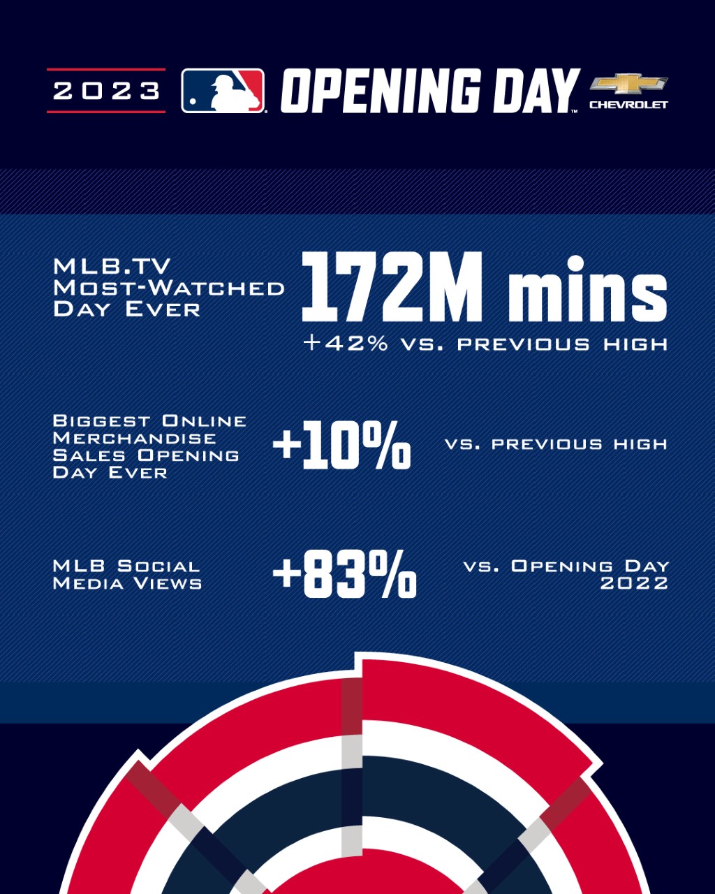 Opening Day 2023 set a record as MLB.TV's most-watched day ever. There were 172 million minutes watched, over 50 million more than the previous top day, Opening Day 2021, which had 21 million minutes watched. That's a 42% gain.