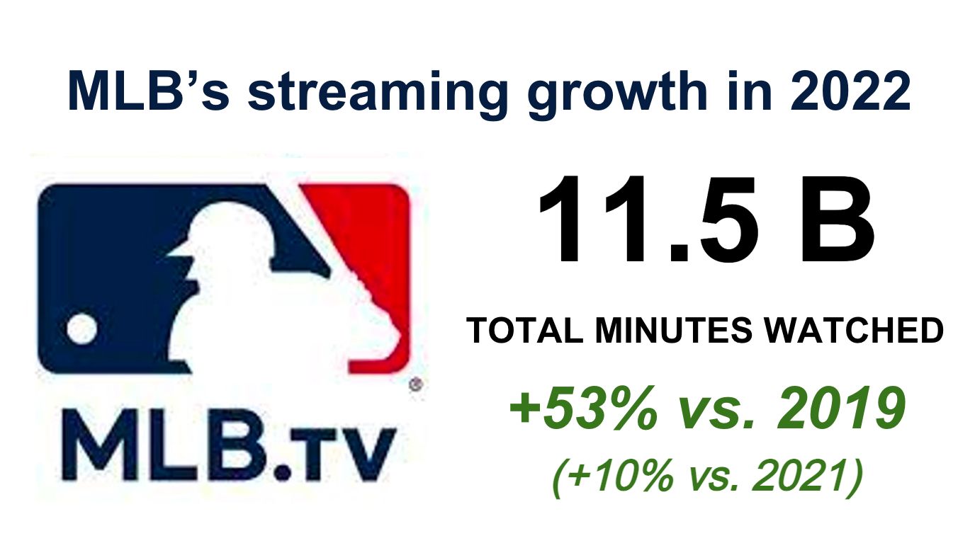 At the end of the year, there were more than 11.5 billion total minutes watched on the MLB.TV platform. That marked a huge gain from the last season before the COVID-19 pandemic, 2019, and there was also a significant increase in MLB streaming just from 2021 to '22.