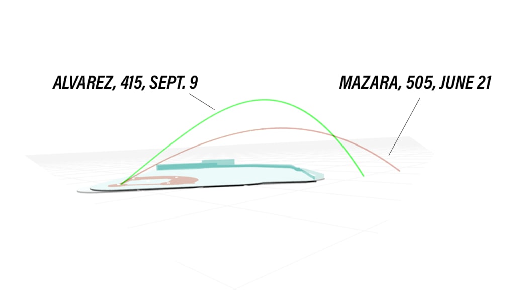 Now, generally, balls hit down the line are a bit of a visual trick, because the foul poles are the shortest part of a stadium, and so balls hit there always look longer than they are. (For example, 400 feet to left field in Fenway is out of the park by 70 feet and onto the street. But 400 feet to center field in Fenway is probably caught by Jackie Bradley Jr.) That's what happened with this Yordan Alvarez blast in Houston that went "only" 415 feet, because the right-field pole in Minute Maid Park is a mere 326 feet away -- not to mention that his was hit higher than Mazara's, which is generally more visually impressive.