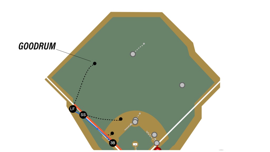 If Goodrum had run a completely straight and direct path to get this one, he would have done it in 138 feet. As it was, he ran 142 feet, which was close enough. Think about how long 142 feet really is, in baseball terms. It's the pitcher's mound to the plate, and back, and then halfway back again. It's home plate to second base, and then 20 more feet into center. It's running home-to-first, and then turning around and running more than halfway back home. It's a long distance, is the point, because Goodrum was playing in the left-center gap against Bregman.