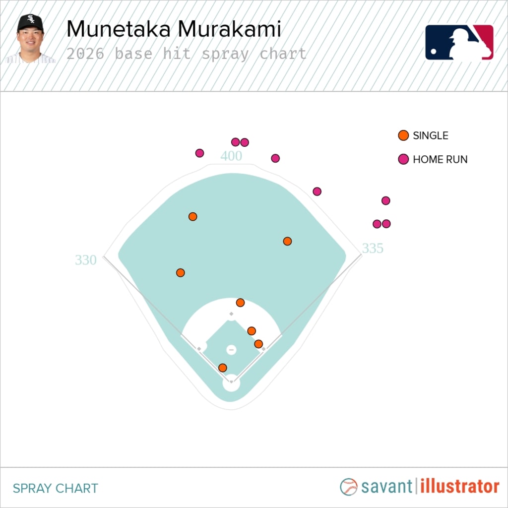 Murakami is what we call a "Three True Outcome" hitter -- those are home runs, walks and strikeouts, which have accounted for nearly two-thirds of Murakami's plate appearance results so far this season.