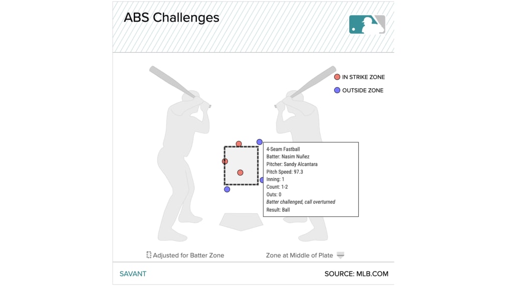 Facing 2022 National League Cy Young Award winner Sandy Alcantara, Nuñez took ball one, then fell into a 1-2 hole on three straight foul balls. As soon as a 97.3 mph fastball was called strike three, Nuñez signaled for an ABS challenge. The call was overturned. Nuñez became the first Nationals hitter to call for a challenge -- and win. (The following inning, he lost a challenge on a strike thrown by Lake Bachar.)