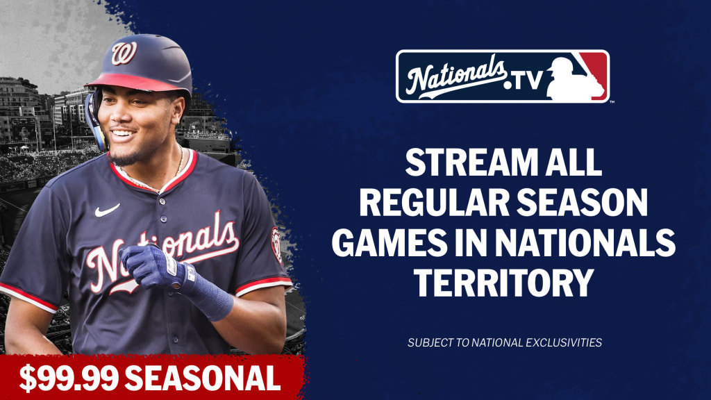 The Nationals.TV Seasonal Package, which allows fans to stream regular-season games in the Washington Nationals home territory with no blackouts (subject to national exclusivities), is available for $99.99, so subscribe now! This offer is only for Nats fans in the Club's Home Television Territory. Information on cable and satellite providers, including specific channel locations, will be announced at a later date.