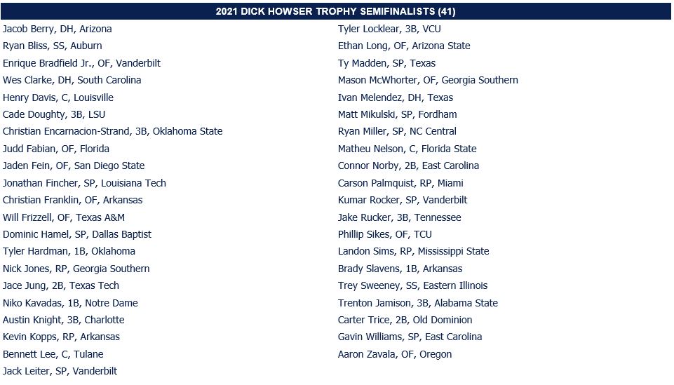 DALLAS (NCBWA) – After the 2020 season was put on hold due to the COVID-19 pandemic, the National Collegiate Baseball Writers Association has released the list of semifinalists for the 2021 Dick Howser Trophy, presented by The Game Headware.