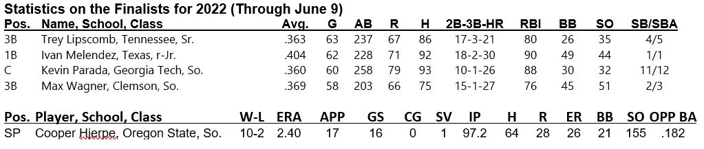 Hjerpe, a finalist for the ’22 Golden Spikes Award, is the lone pitcher mentioned and racked up standout statistics for the NCAA Super Regional host Beavers this season. The All-Pac 12 Conference star was 10-2 in all games with a 2.40 earned run average and a stunning 14.3 strikeouts per nine innings. He already has been named first team All-America on a consensus basis and was an NCBWA Dick Howser Trophy co-National Pitcher of the Week on April 5.