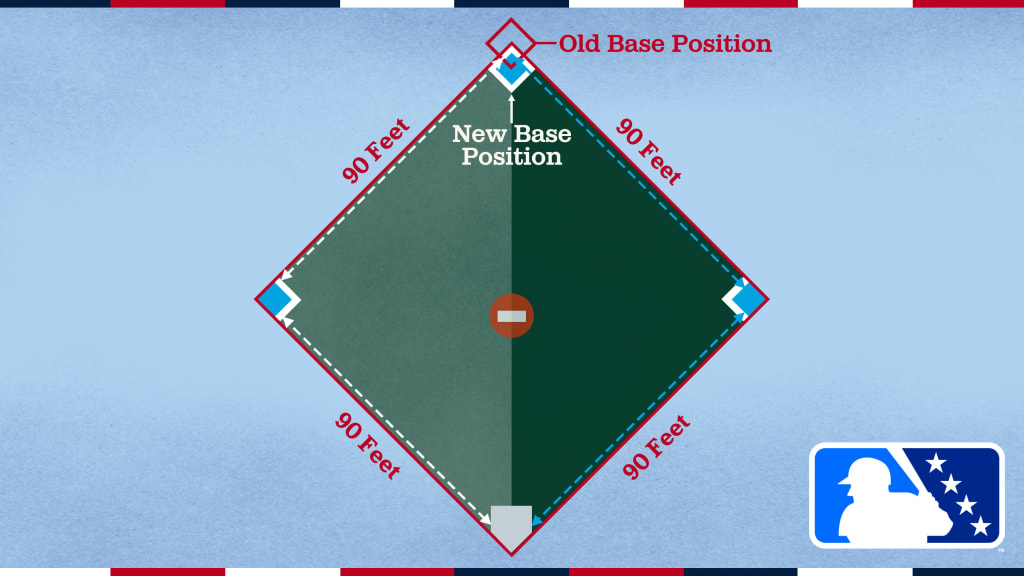 In the International League, beginning in the second half of the season, the second-base bag will be placed entirely within the perimeter of the infield diamond. Visually, that means the bag will be closer to home plate. More pertinently, it will be roughly nine inches closer to the first-base and third-base bags.