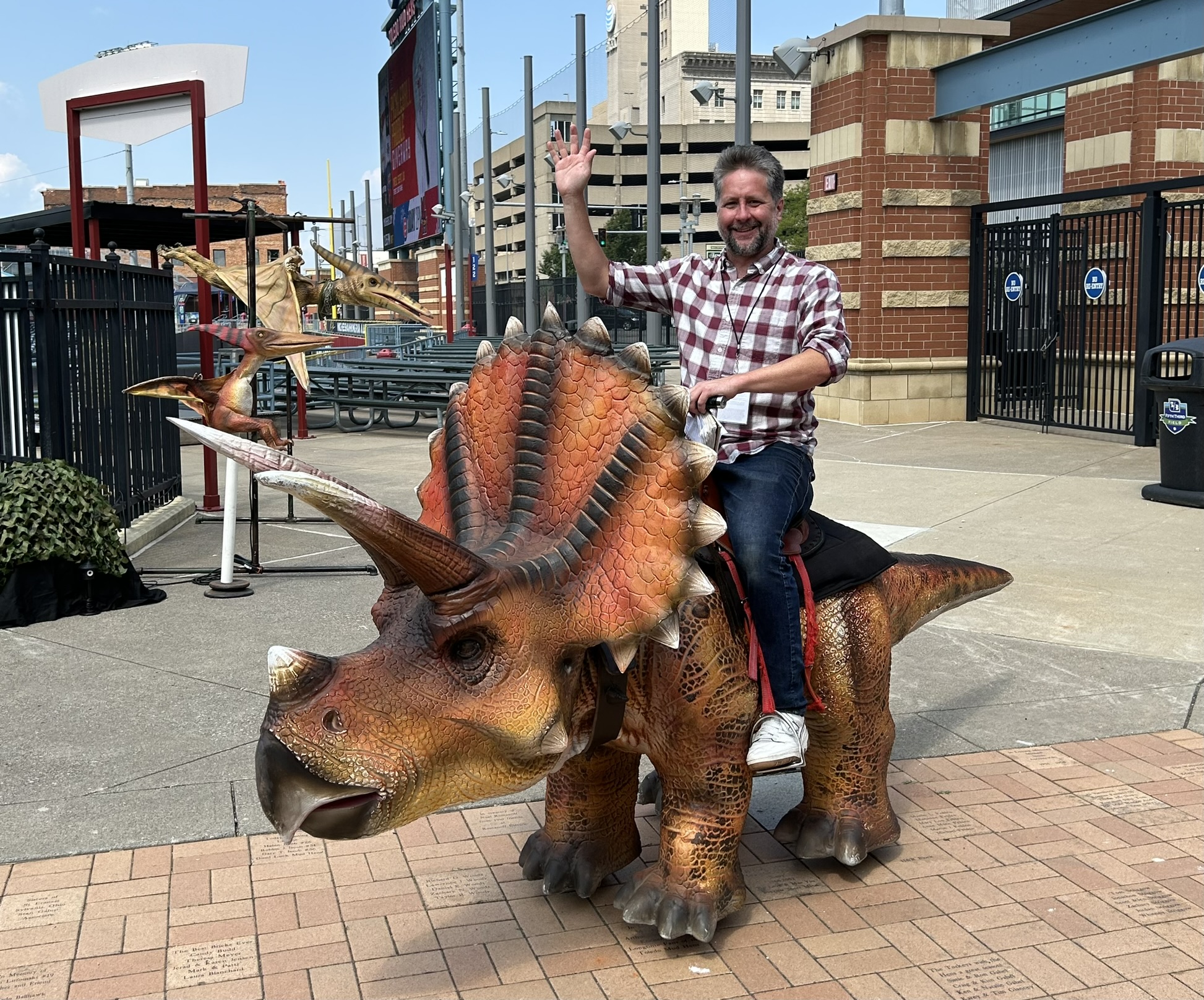 Meanwhile, and most pertinently for the average fan in attendance, it was Dino Day. Ed’s Dinosaurs Live, a North Carolina-based operation, hauled up several truckloads of animatronic and inflatable dinosaurs. There were impressive looking dinos all over the concourse. The kids loved it, and so did I. I got to ride a triceratops.