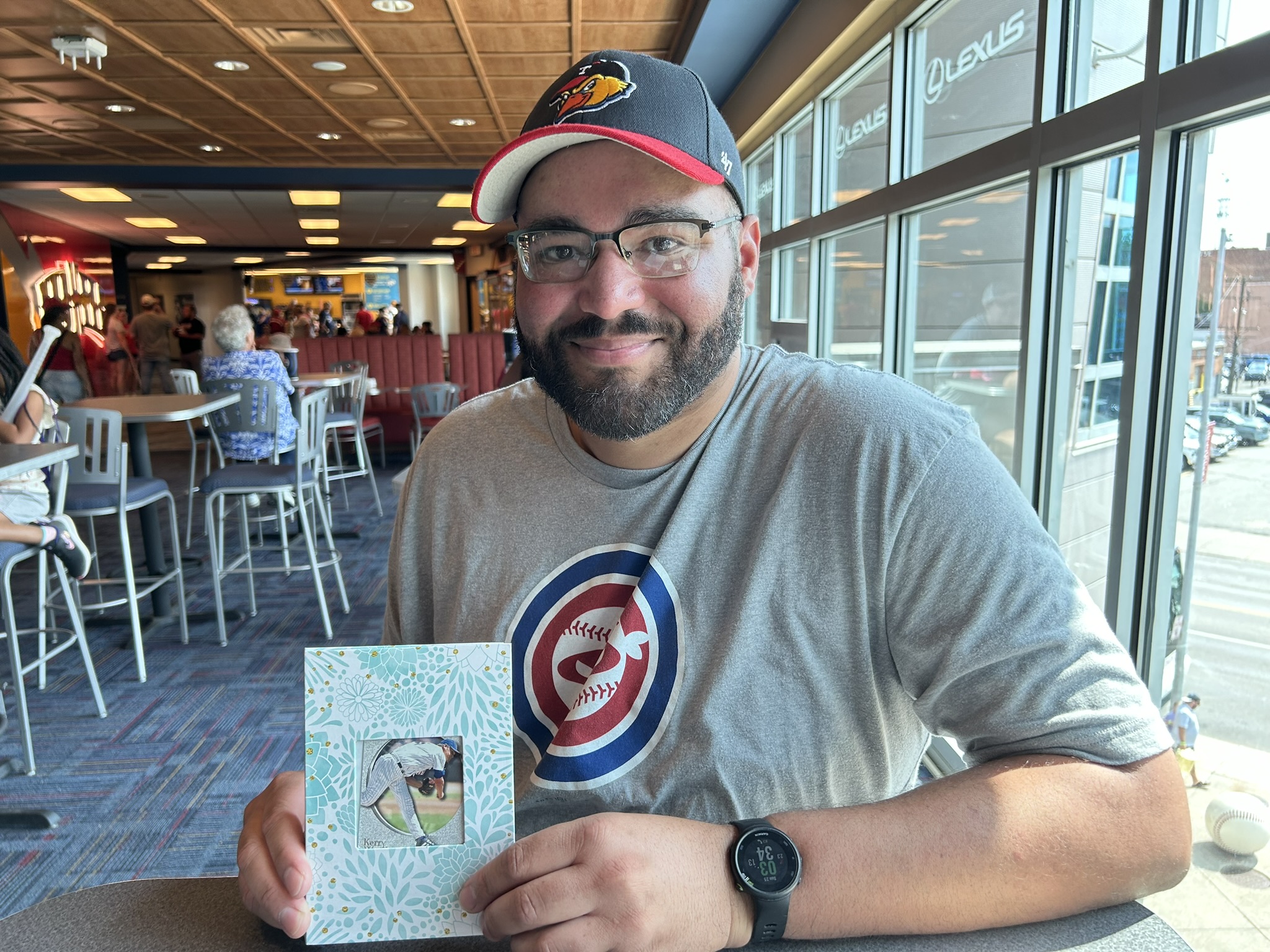 Meet Adam Rutz, my Mud Hens Designated Eater, a south Toledoan who works in the circulation department of a local library. Adam roots for both the Mud Hens and the Chicago Cubs, considering it “extra awesome” when the Mud Hens play the Iowa Cubs. As we were speaking a guy who had noticed Adam’s Cubs shirt came by and gave him a book filled with Cubs baseball cards. Very random, very kind. That’s what he’s holding in the above photo.