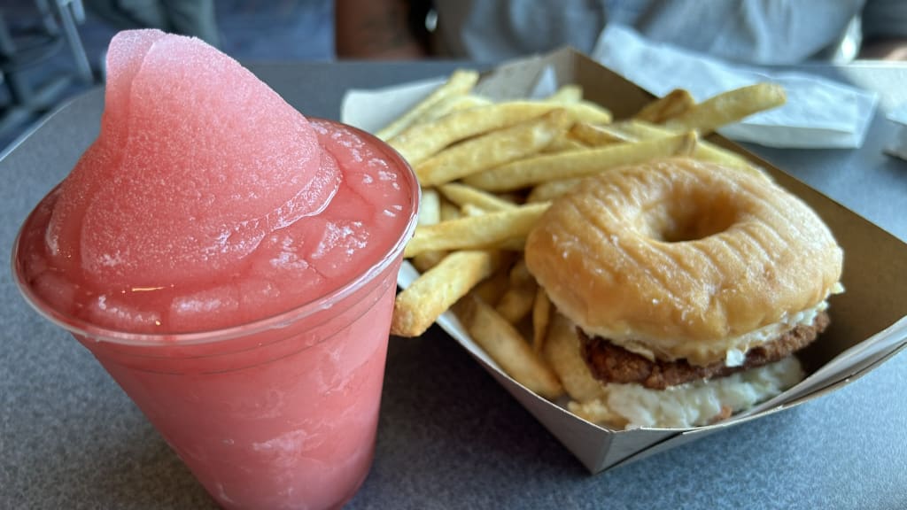 In the below photo, you’ll see Adam’s meal: a Heated Hen Donut Sandwich, washed down with a Strawberry Dragonfruit Sangria Slush (made by local Urban Pine Winery).