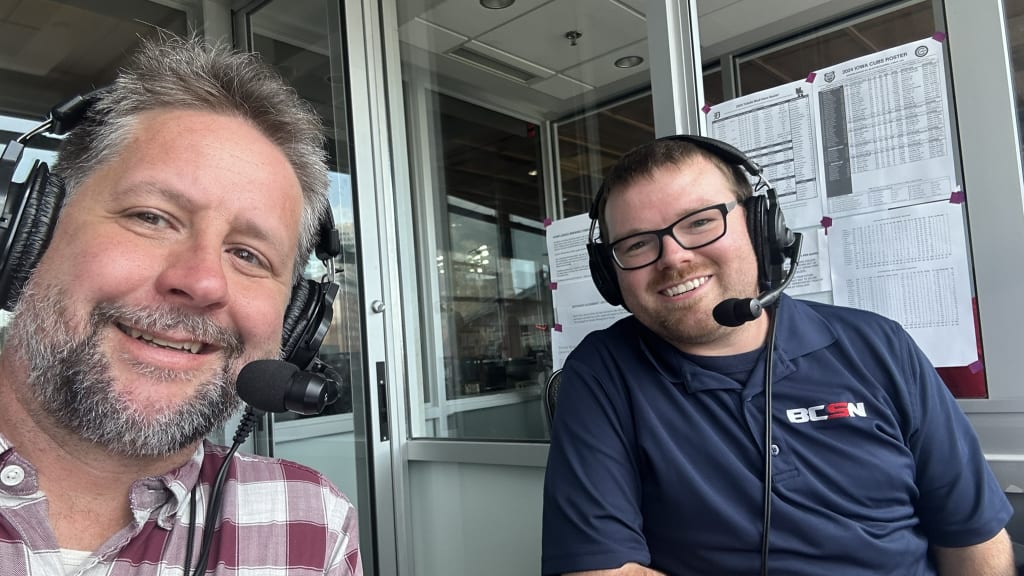 The Adams and I were in the Birdcage Club, and from there it’s a short walk to the broadcast booth. I spent an inning on the air with Kevin Piel, calling the game for the Iowa Cubs.
