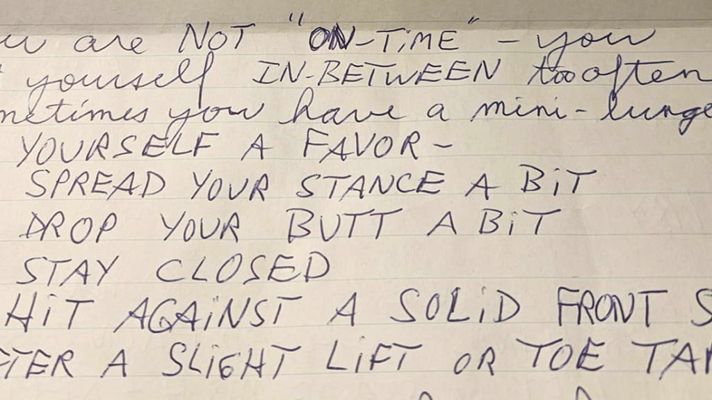 “Do yourself a favor,” it reads, in part. “Spread your stance a bit. Drop your butt a bit. Stay closed. Hit against a solid front side after a slight lift or toe tap.”