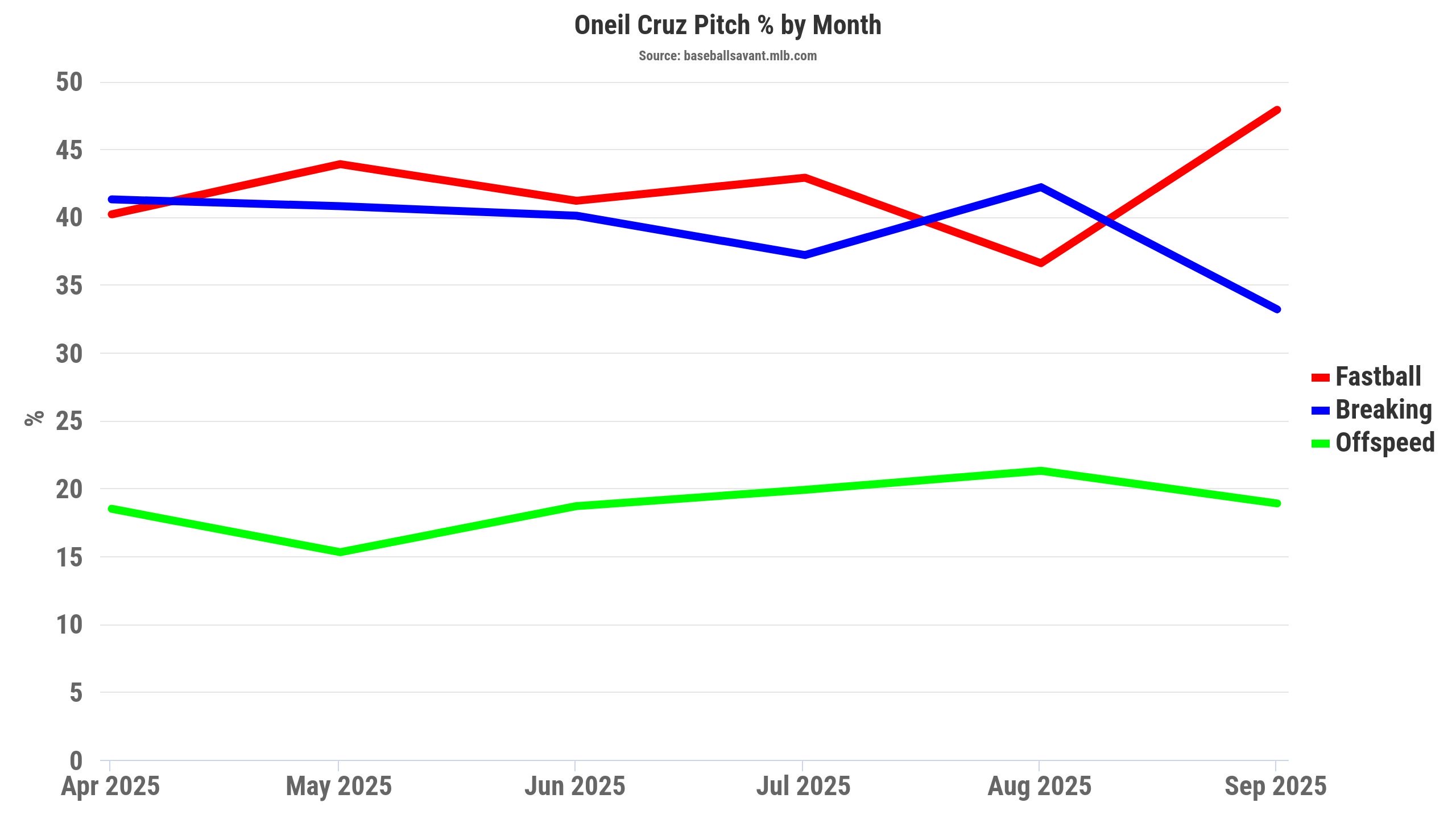 Cruz earned his reputation as a free swinger early in his career, but he actually took a positive step here in 2025. His chase rate dropped from 31.7% to 28.1%, and is now basically league average. The mindset has always been to force pitchers into the strike zone, and then he can do damage.