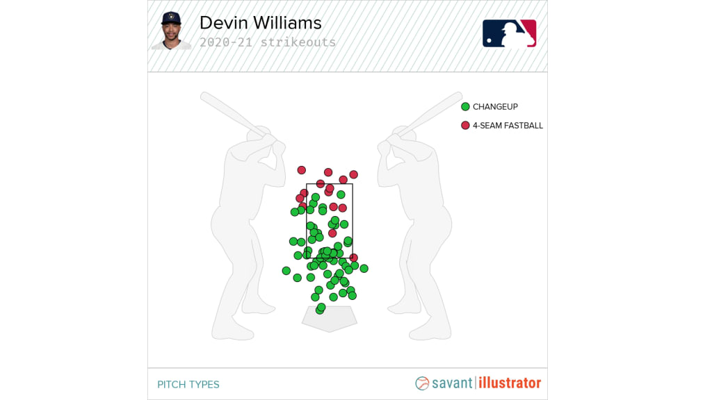 There is no shortage of nasty pitches across the Majors these days, but Devin Williams' changeup (dubbed the “Airbender”) certainly ranks near the top of the list. The unique pitch was key to Williams’ 2020 NL Rookie of the Year campaign, and it’s made life tough on hitters again this year. Williams’ 66 strikeouts with it since the start of 2020 are by far the most by any reliever on any pitch type.