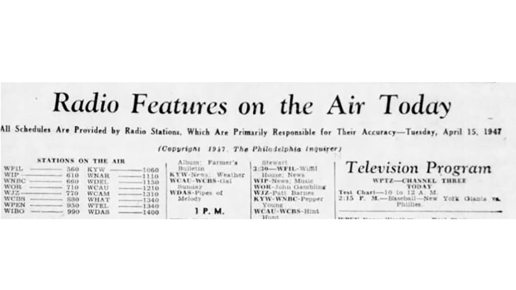 “It was none other than Opening Day on Tuesday, April 15, 1947, a game that featured the Phillies versus the visiting New York Giants. In that day’s edition of the Philadelphia Inquirer newspaper, there is a column on page 27 titled, Radio Features on the Air Today. (Keep in mind radio was king in 1947, while television was just emerging from its infancy.) The column is dominated by a listing of programs on Philadelphia’s numerous radio stations, but there is a small box incorporated within the column with the subtitle, Television Program: WPTZ -- Channel 3 Today. There are exactly two program entries for the station that day, reflecting the primitive state of the television broadcast industry.