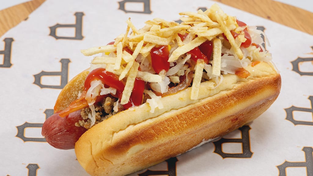 Boricua Dog: A hot dog featuring sofrito beef, Smallman Street Deli kraut, yellow mustard, American cheese, ketchup, braised onion and potato sticks. Served on a roll. (Section 135)