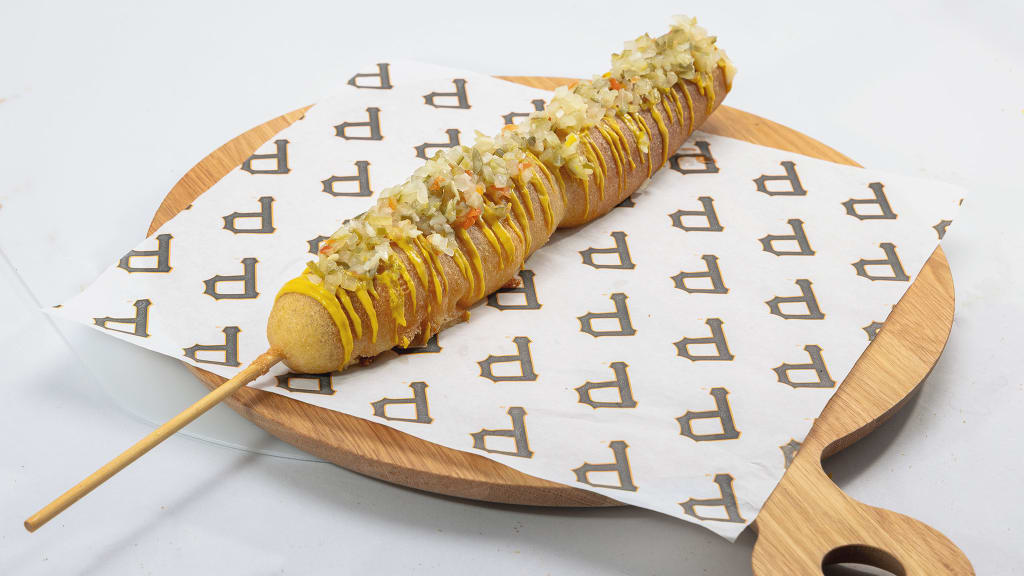 Heavy Hitter Dog: A footlong hot dog with cornbread coating, yellow mustard and pico de gallo. Served in a baseball bat boat. (Section 146)