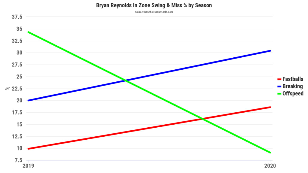 Meanwhile, Reynolds is chasing fewer pitches outside the strike zone, and his improved walk rate would seem to indicate that he’s seeing the ball fine. But he’s swinging and missing at pitches in the zone, both fastballs and breaking balls, much more often than last year.