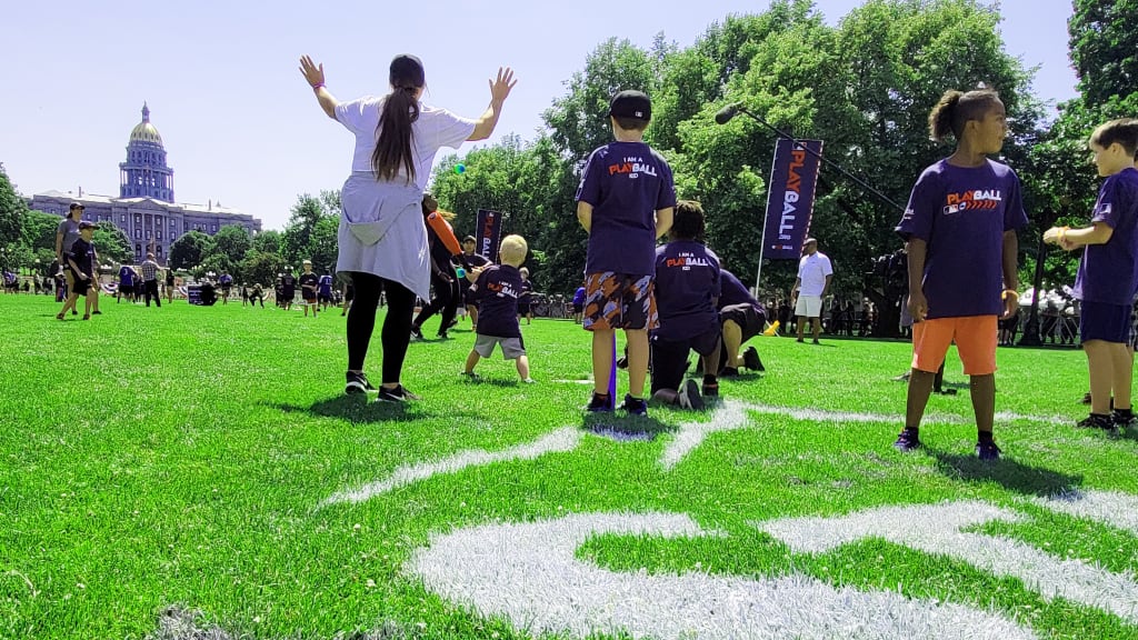 Denver Mayor Michael B. Hancock was joined by Rockies owner/chairman and CEO Dick Monfort and MLB chief baseball development officer Tony Reagins to launch the program, featuring kids participating in a series of fun-focused, informal baseball- and softball-centered activities.