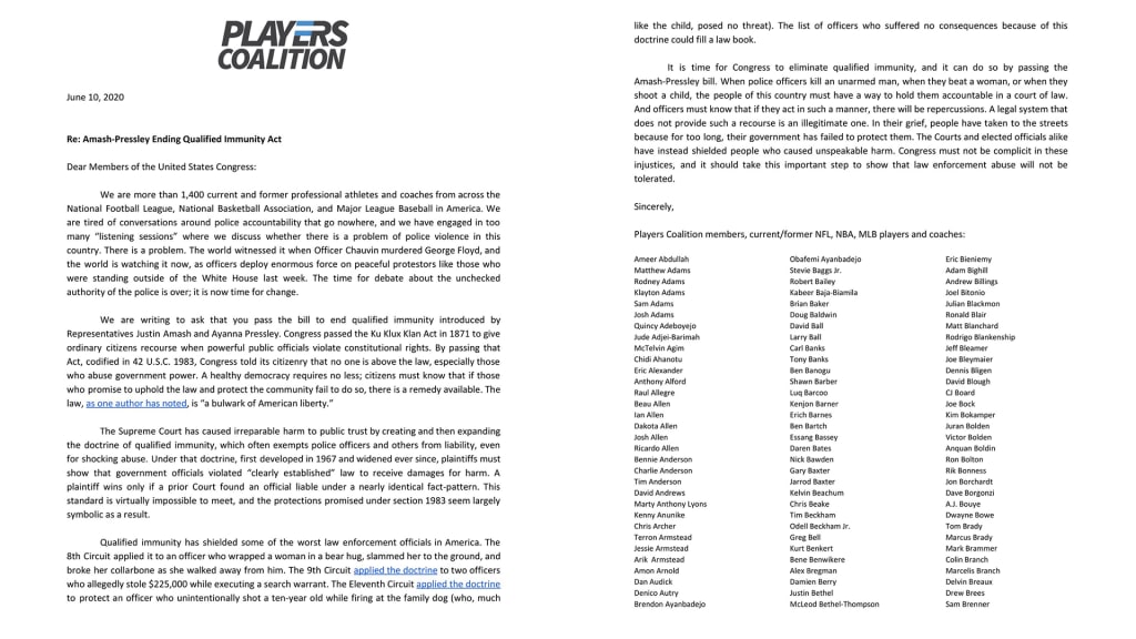 More than 1,400 current and former players, coaches and general managers from MLB, the NFL and the NBA have signed a letter from the Players Coalition to Congress in support of a bill that calls for an end to qualified immunity.