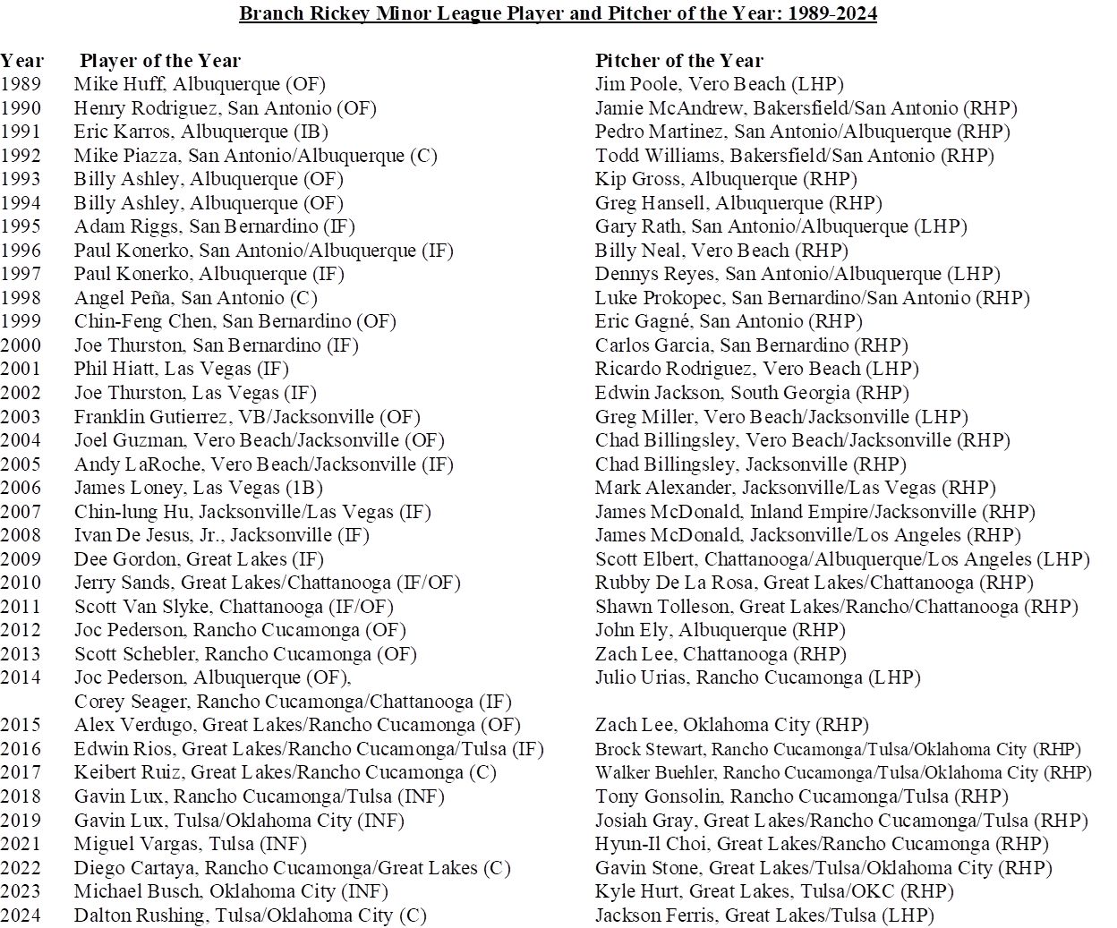 LOS ANGELES - The Los Angeles Dodgers named catcher/outfielder Dalton Rushing as the 2024 Branch Rickey Minor League Player of the Year and left-handed pitcher Jackson Ferris as the 2024 Branch Rickey Minor League Pitcher of the Year.