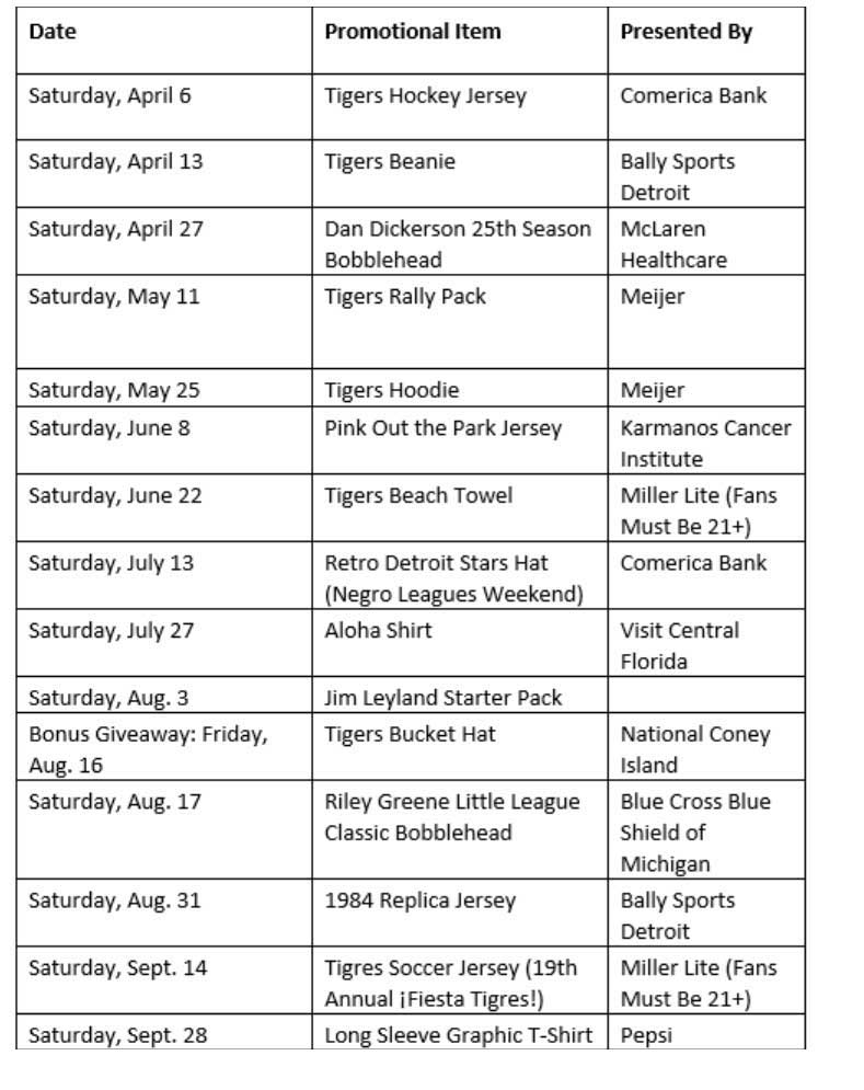 Additional new theme games include Healthcare Appreciation (April 11 and 12), Pickleball Day (May 15), Margaritaville Night (June 21), Firefighter vs. Law Enforcement Night (July 10), Christmas in July (July 11), 80s Night (Aug. 30) and much more. Fans interested in special ticket packages, with many featuring an exclusive giveaway item, can visit Tigers.com/Theme.
