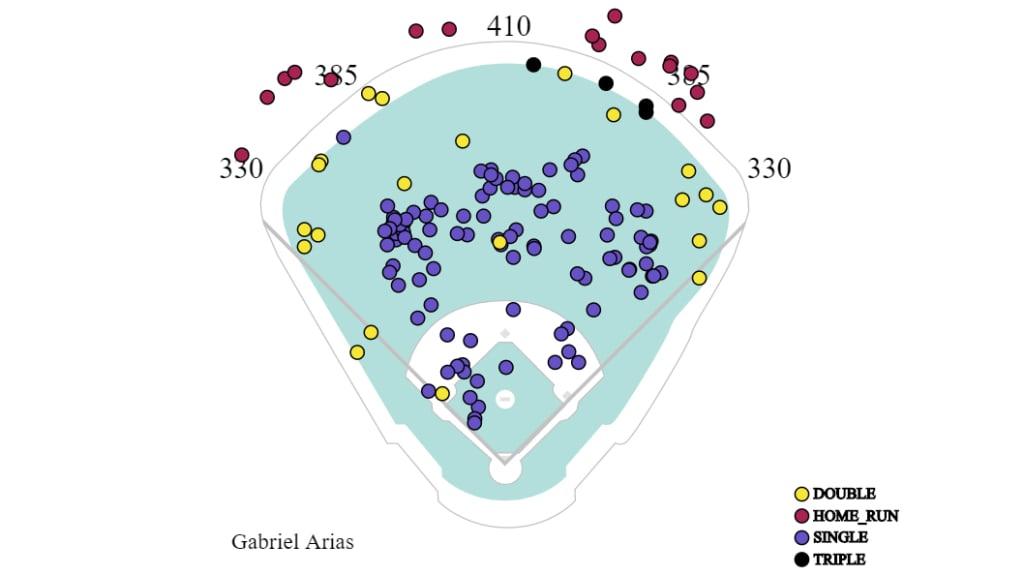Gabriel Arias, SS (Padres No. 14): After an underwhelming first full season at Class A Fort Wayne (.240/.302/.352, 6 HR), Arias moved up to Class A Advanced Lake Elsinore in 2019 and slashed .302/.339/.470 with 17 homers in his age-19 season. While he surely benefitted from the California League’s hitter-friendly environments, the teenage shortstop made notable improvements with his approach and quality of contact. Notably, Arias fared better when trailing in the count compared to the previous year, boosting his FB+LD rate in such counts from 12.5 to 17.2 percent. Overall, Arias’ FB+LD rate on BIP climbed from 43.1 to 49.7 percent, while his ground-ball rate dropped from 53.7 to 44.4 percent.