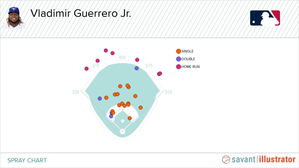 That's changed this year. Slimmed down by 40 pounds in the offseason, Guerrero is crushing the ball, and is on pace for 49 dingers. He's going to all fields, too. Here's a spray chart of all his hits: